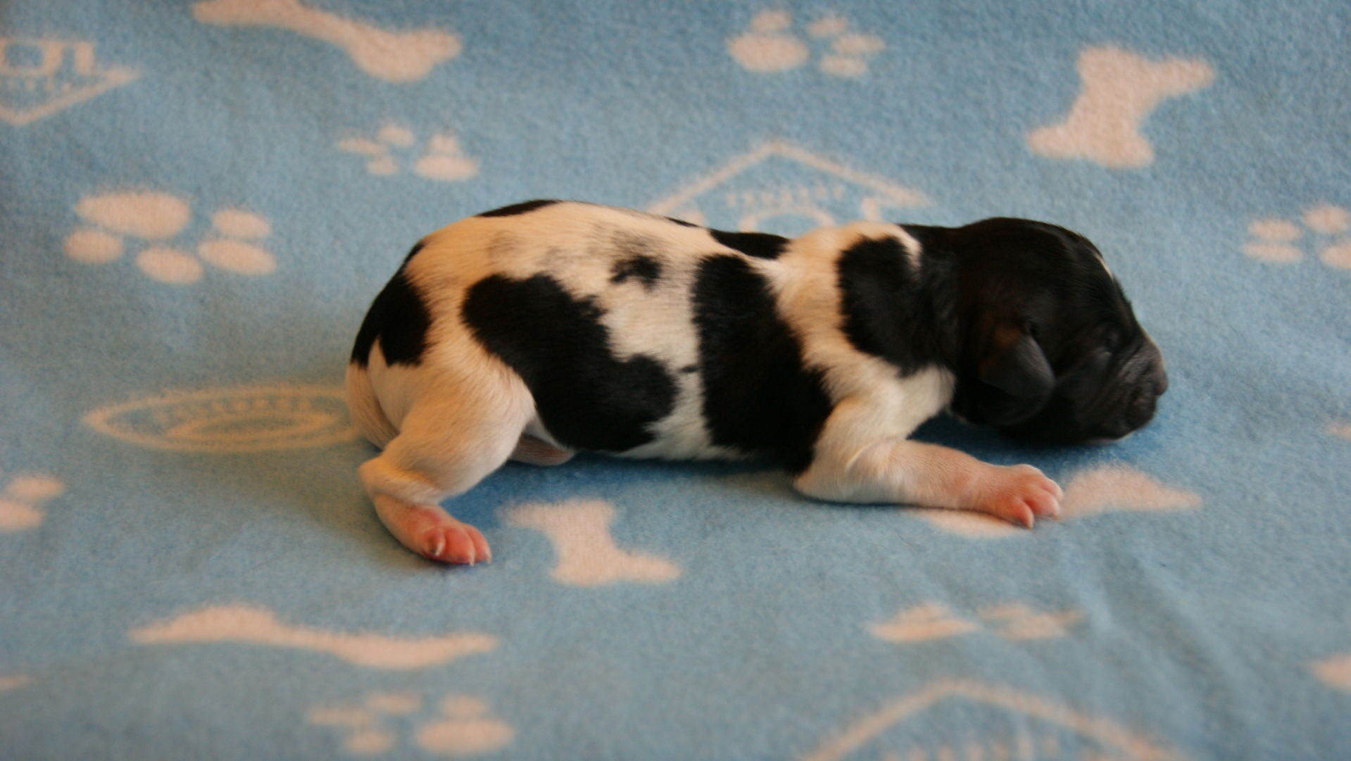 Pupje 1., een teef, werd om 3.00 u geboren en weegt 280 gr.