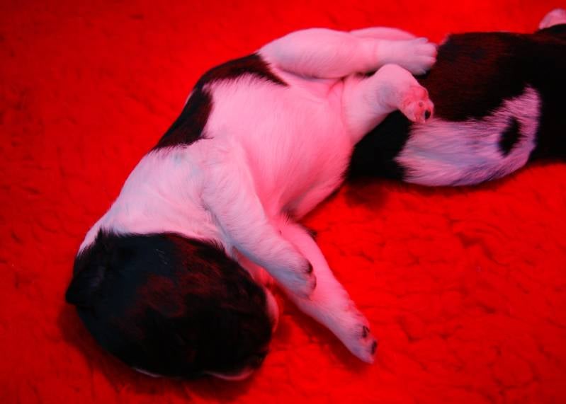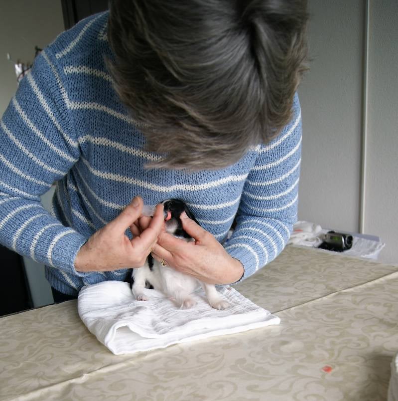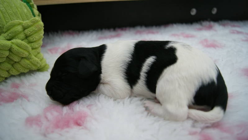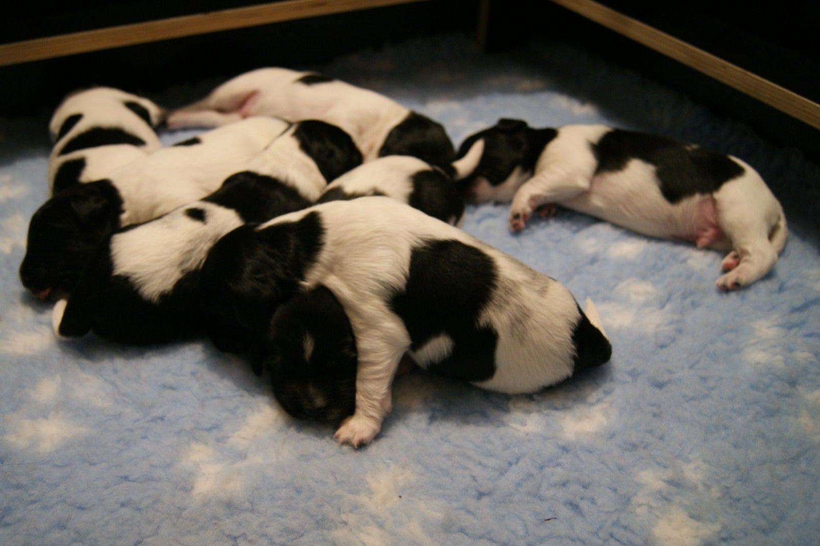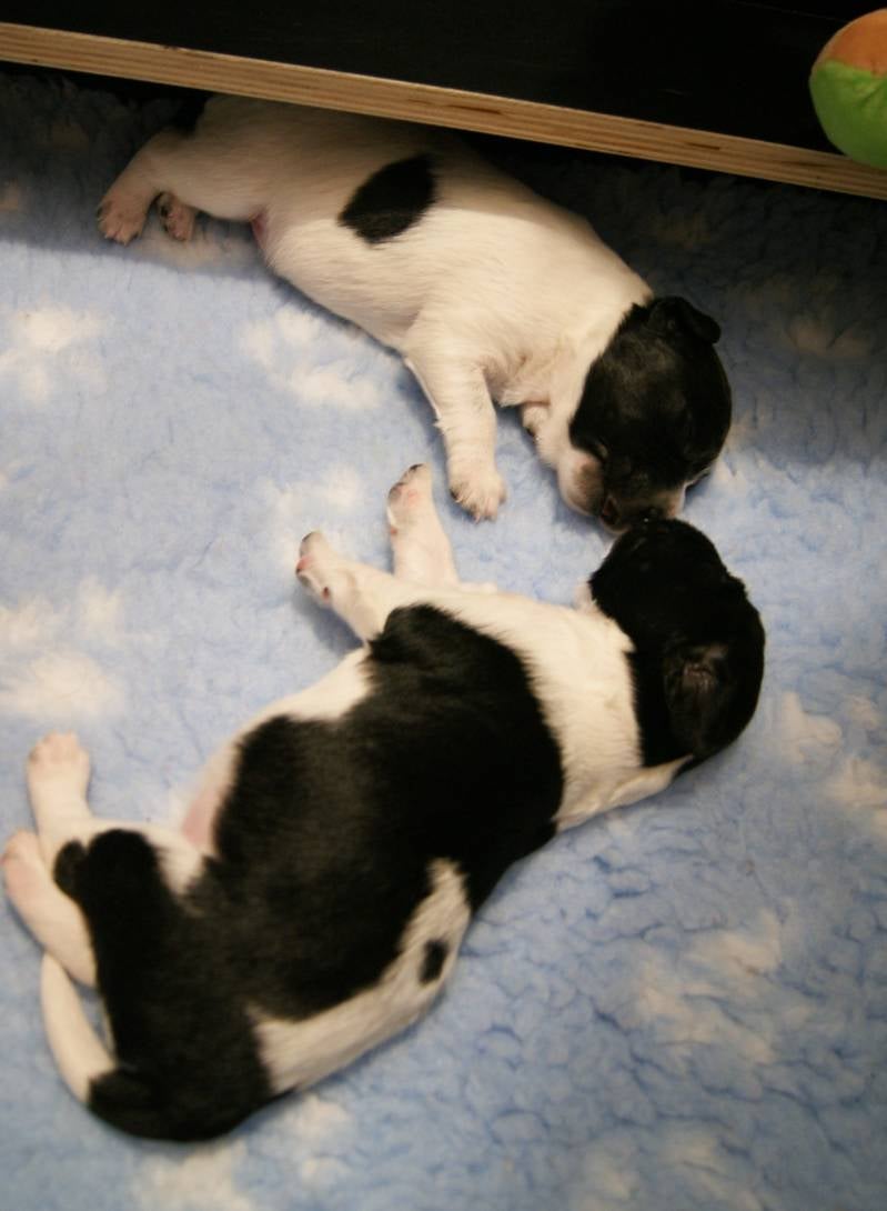 De groene vakjes geven de dag aan waarop het geboorte gewicht is verdubbeld, de gele waarop de oogjes open gingen en de rode vakjes de dag waarop de pups zijn ontwormd.