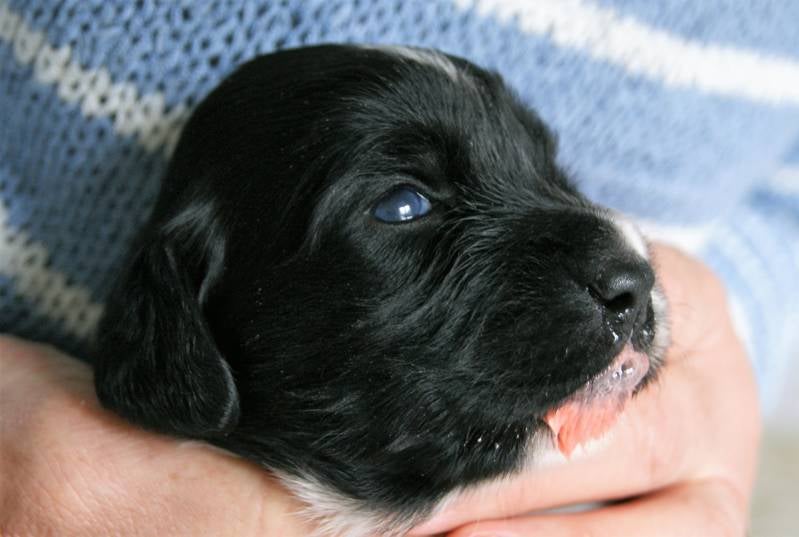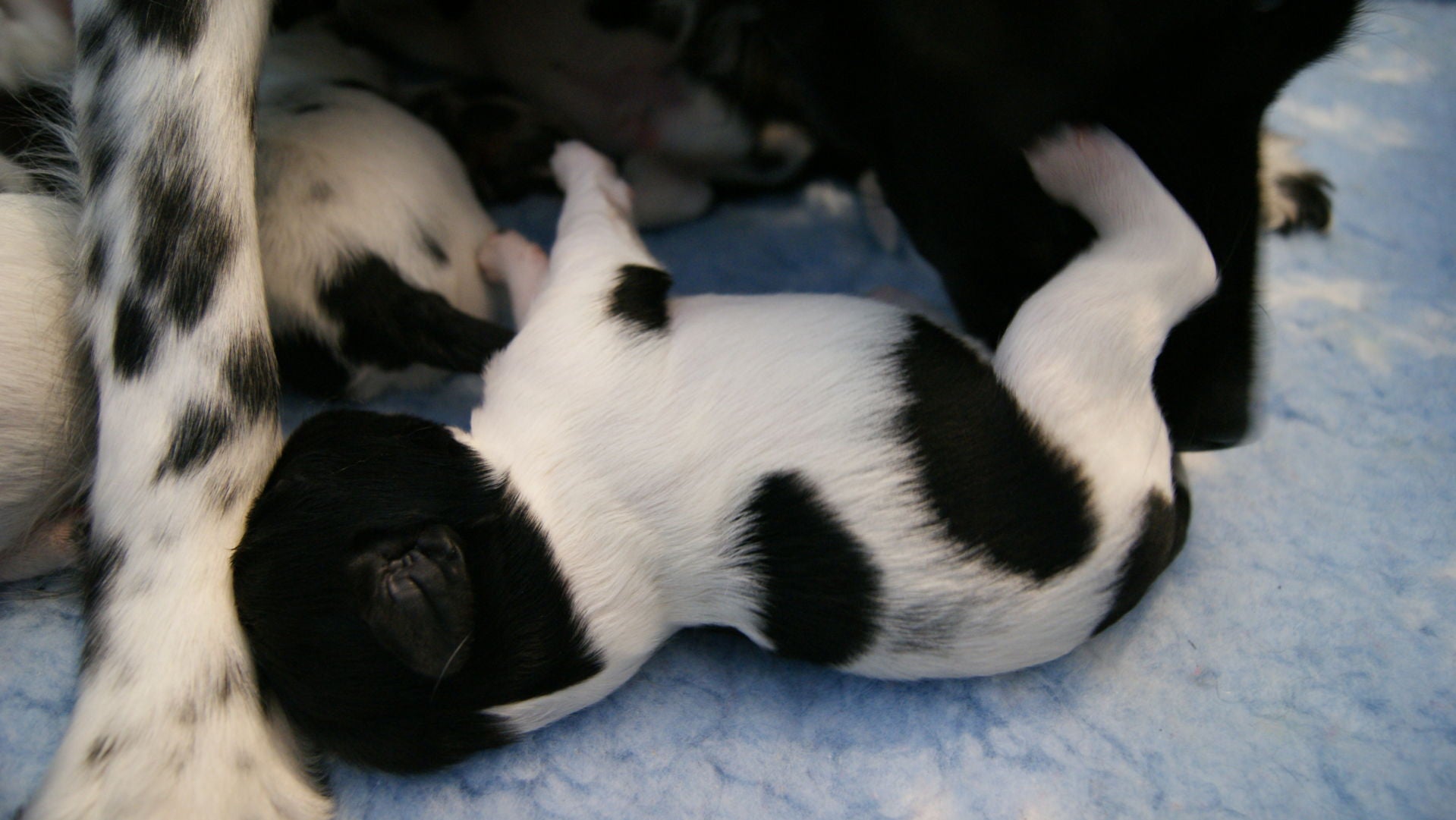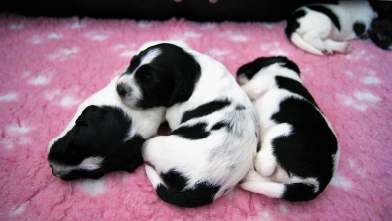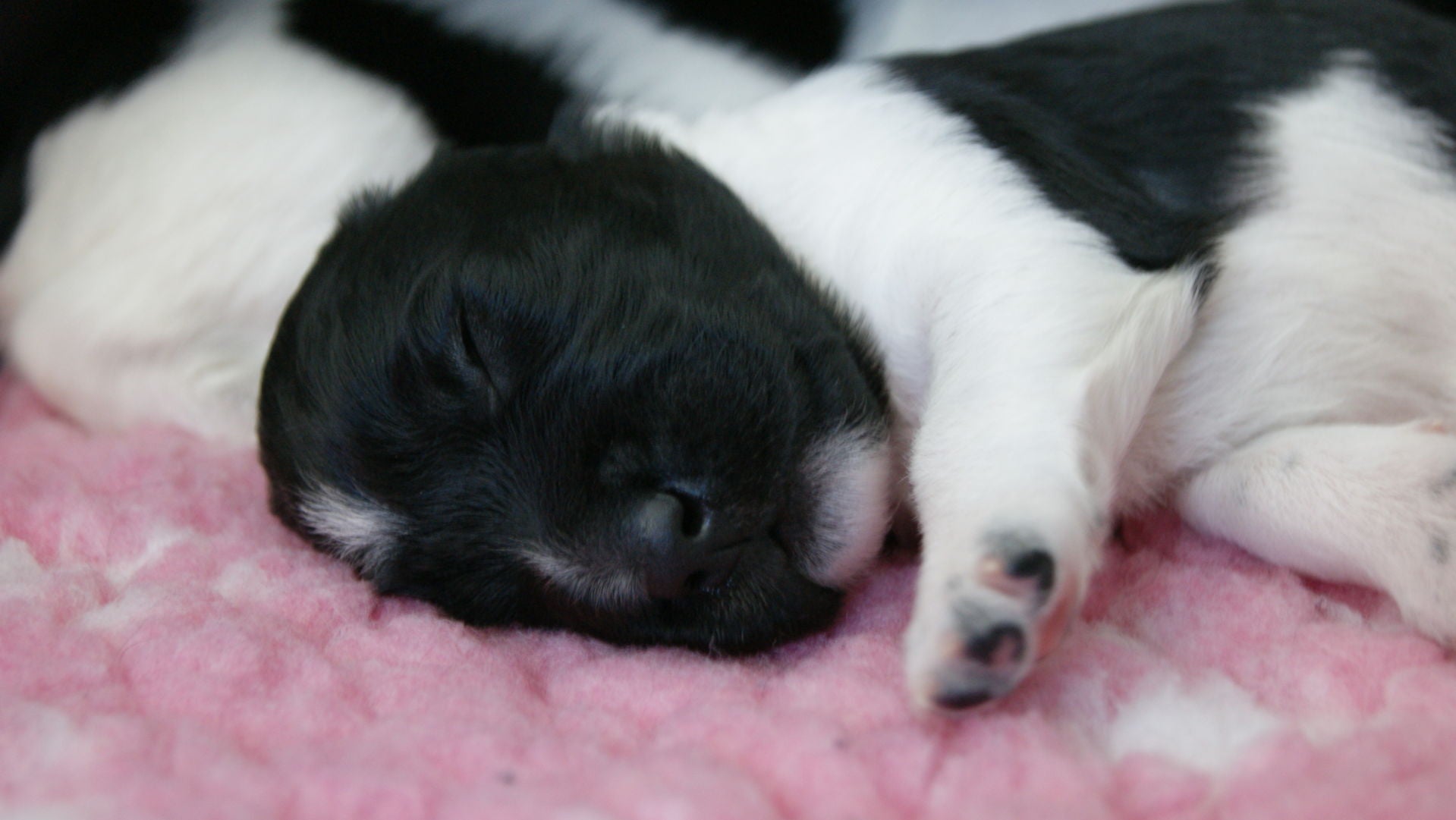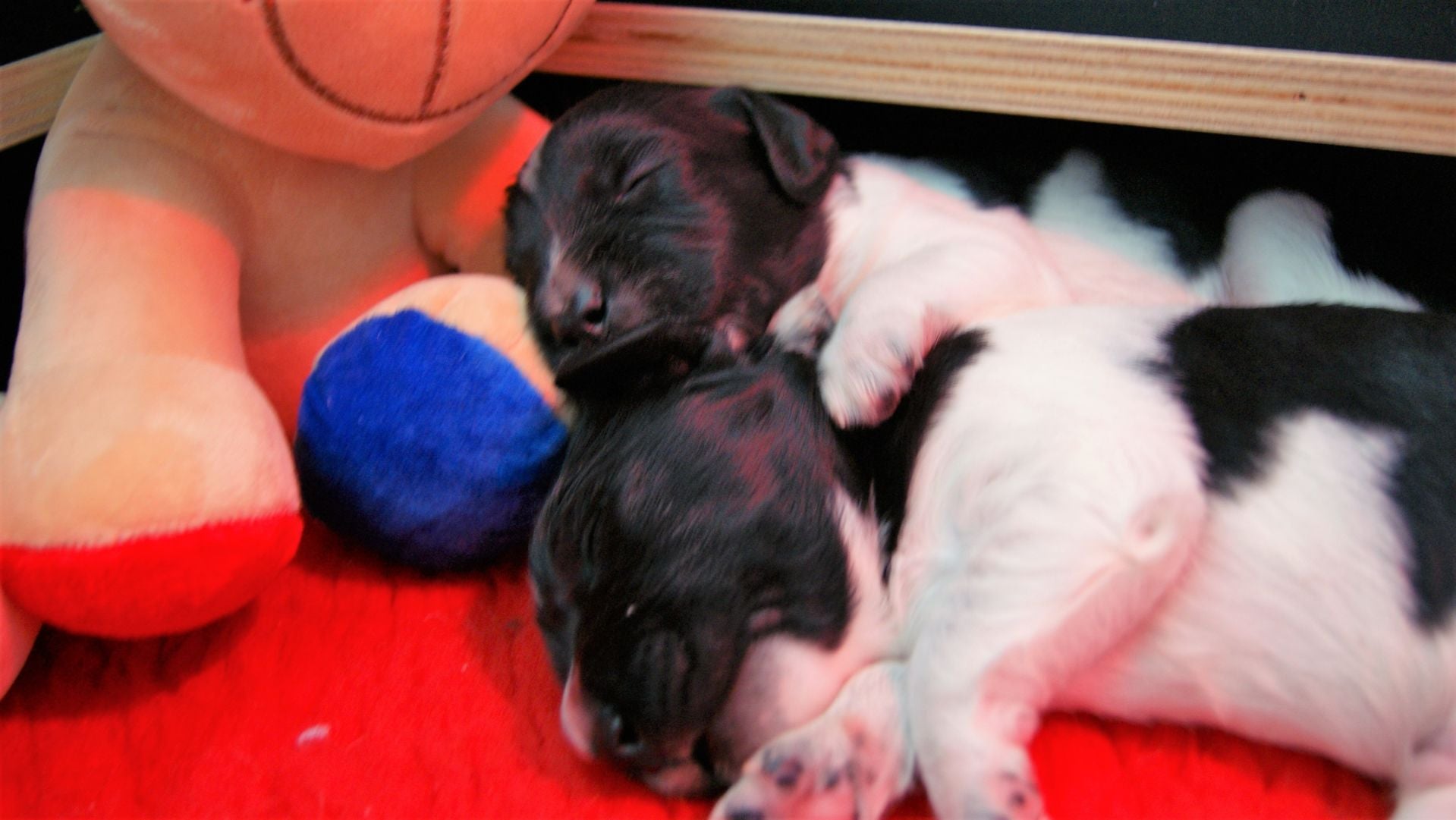 De groene vakjes geven de dag aan waarop het geboorte gewicht is verdubbeld, de gele waarop de oogjes open gingen en de rode vakjes de dag waarop de pups zijn ontwormd.